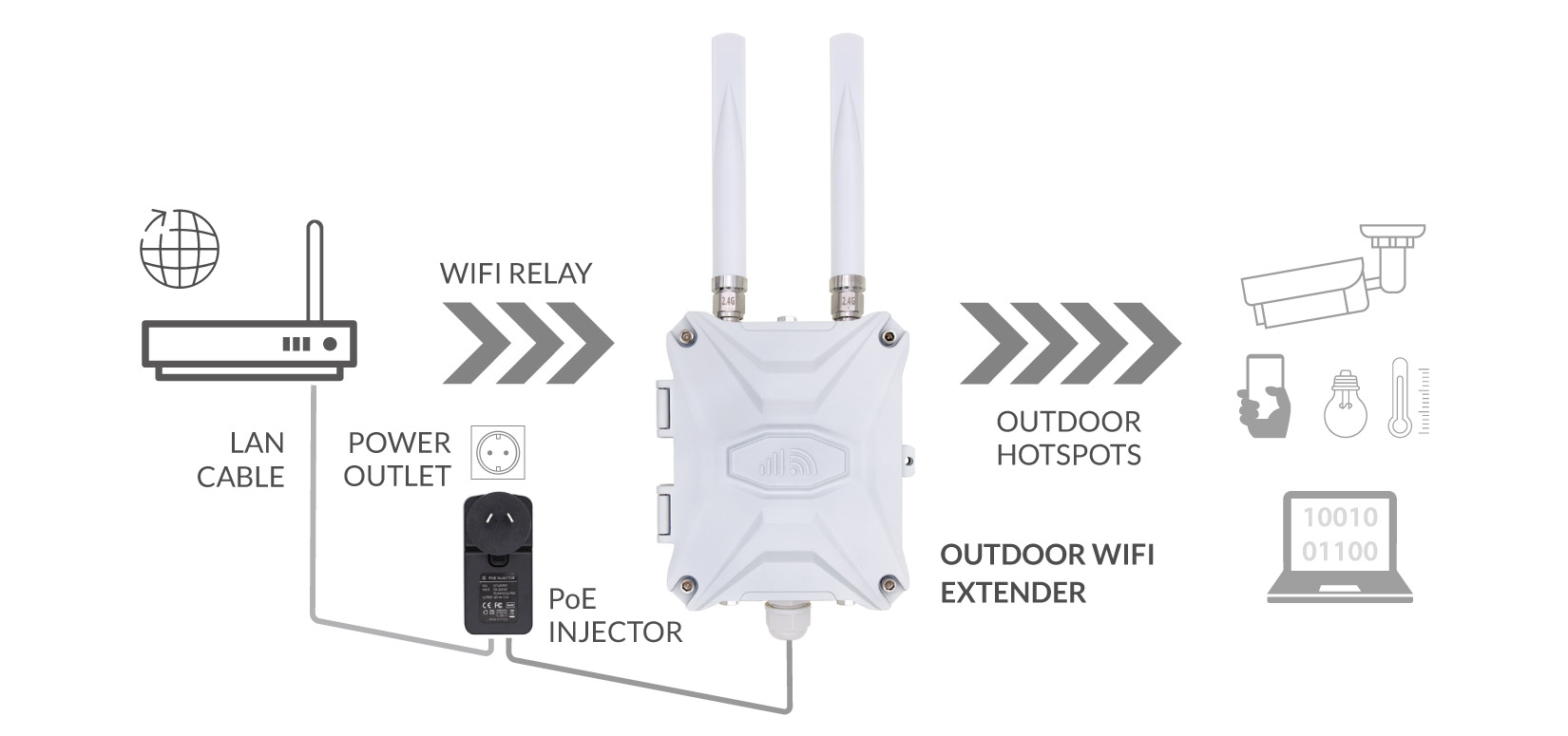 Using WiFi relay technology, the outdoor WiFi extender can connect wirelessly to your 2.4GHz WiFi hotspot. Alternatively, connect the extender to your internet router via a LAN cable through a PoE injector. The PoE (Power over Ethernet) injector delivers power through the LAN cable, eliminating the need for a separate power source and simplifying the setup.
