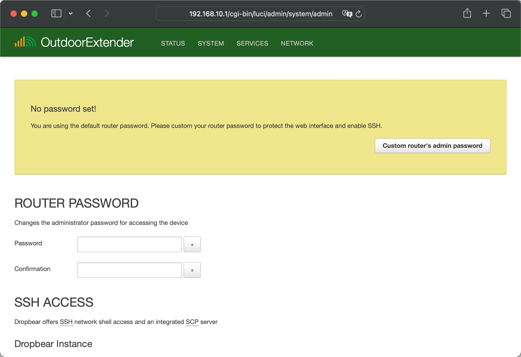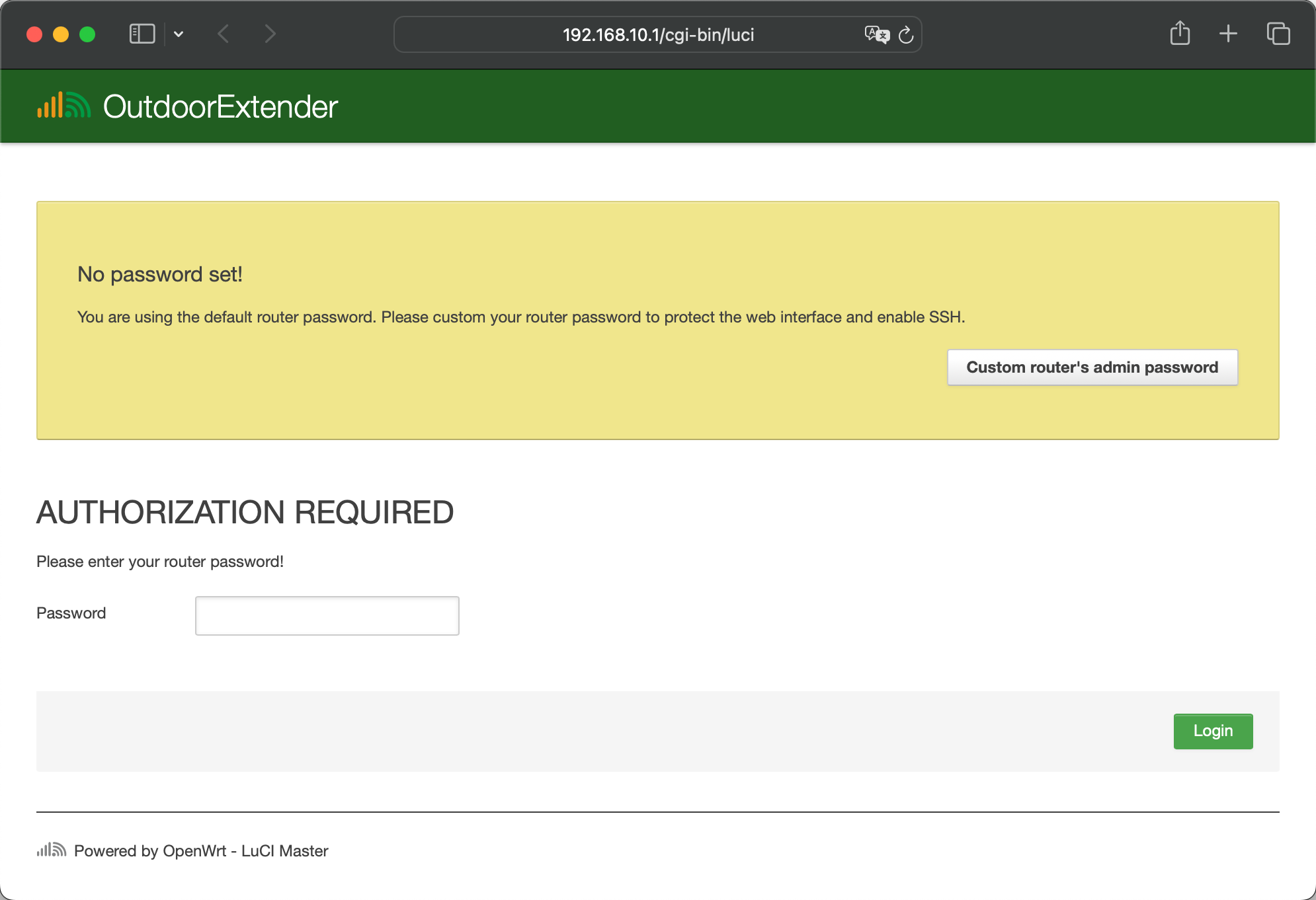 After connecting with Wi-Fi or LAN, open a web browser and enter the router IP 🔗 http://192.168.10.1/ on the address bar. The default setting has no password. Click the Login button to access the router's admin panel.