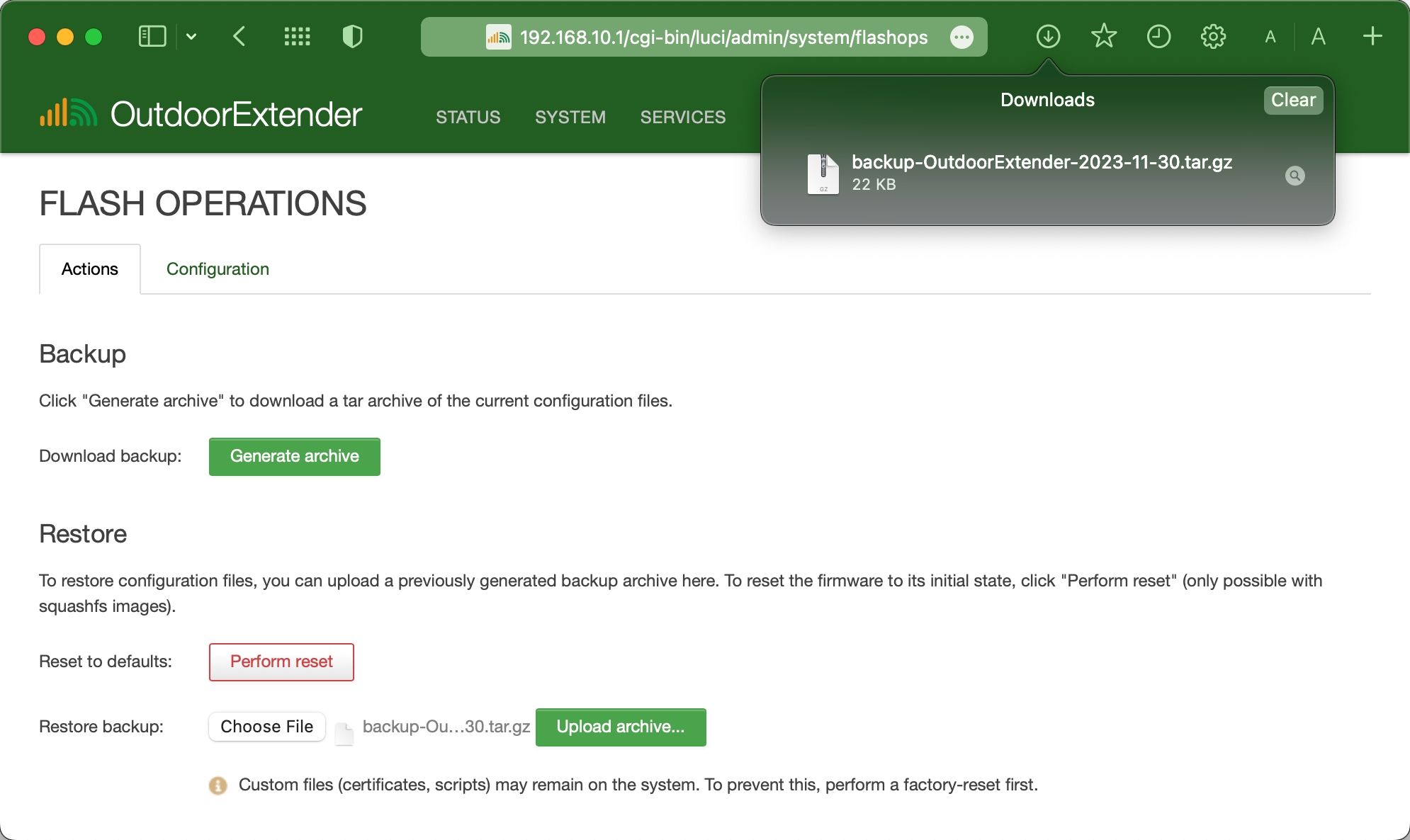 Under the "Actions" tab, click the "Generate Archive" button to download the backup file of current extender configurations.