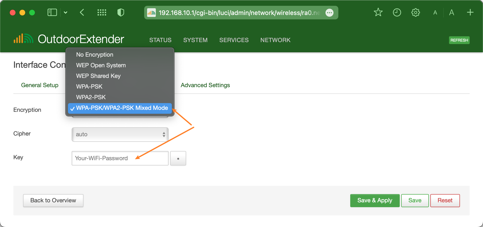 Encryption - Select the encryption method. Using "WPA2-PSK" or "Mixed WPA/WPA2" encryption with a strong password is highly recommended to prevent unauthorized access.