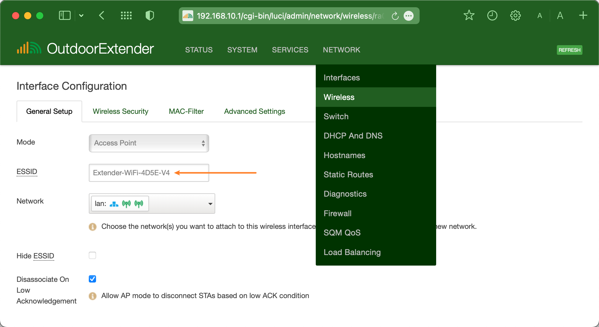 In the Interface Configuration section, click the General Setup tab. You can edit the WiFi hotspot name on the ESSID field.