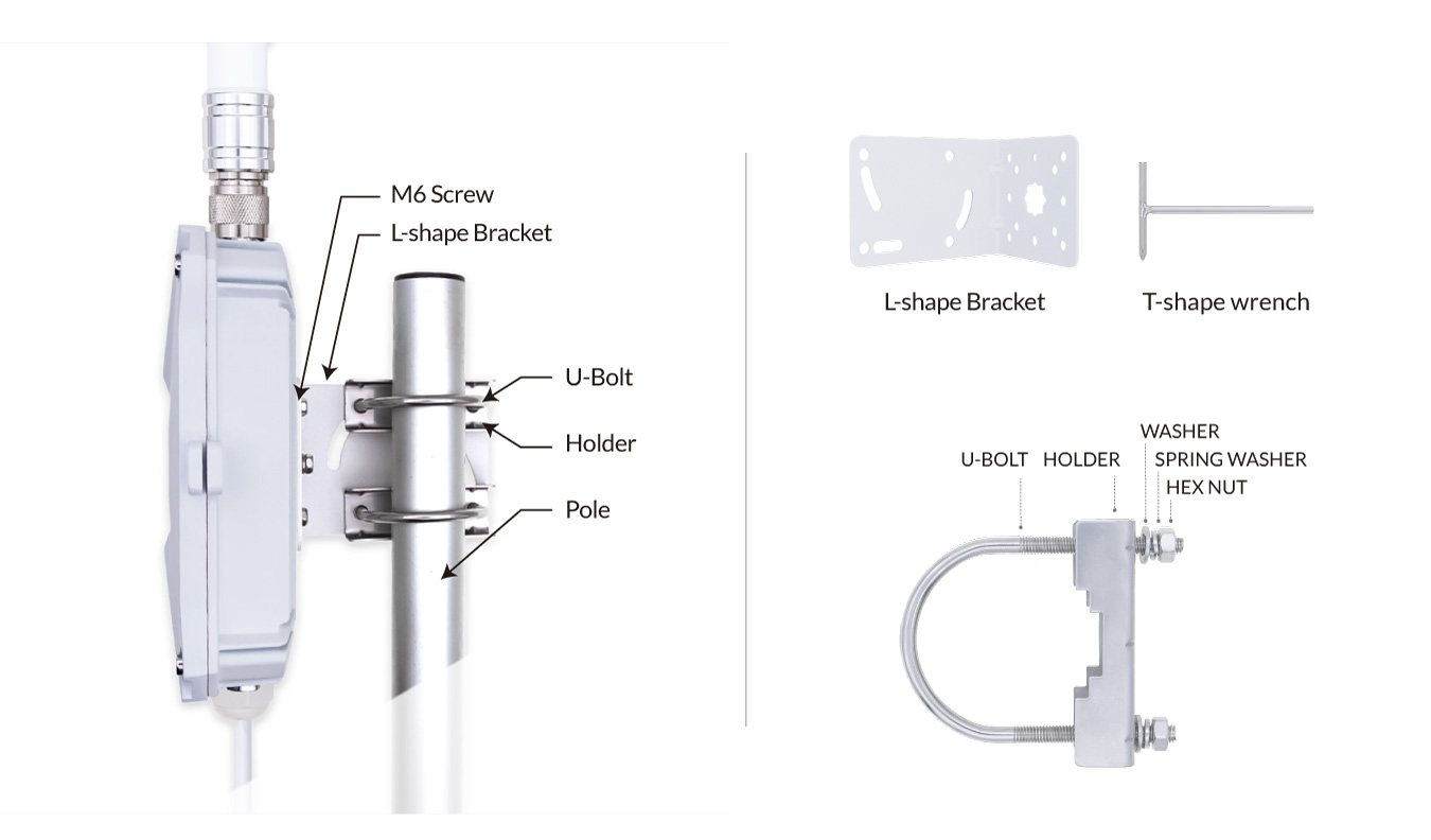 The M6 cross-head screws are fixed on the backside of the WiFi extender. Take them off and use the cross end on the T-wrench to install the L-shape bracket on the backside of the enclosure.